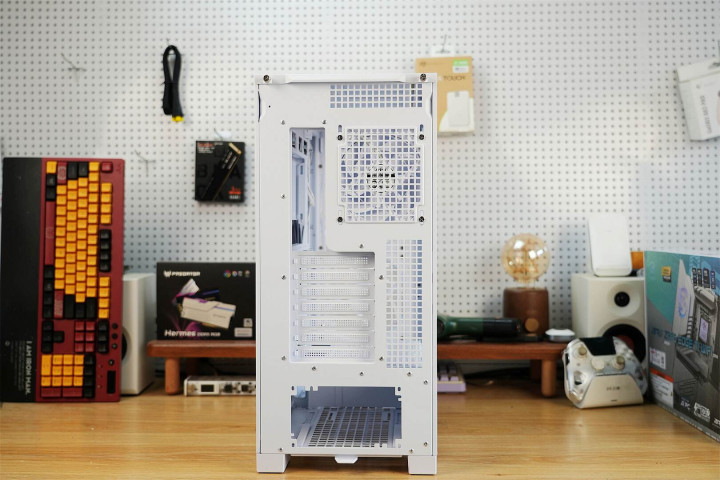 机箱背部延续经典布局,底部设置电源仓,其上方排列着7个PCIE插槽。此外,机箱自带一个出厂预装的120mm风扇,且顶部预留冗余空间并采用网孔通风设计。