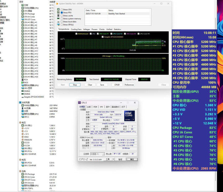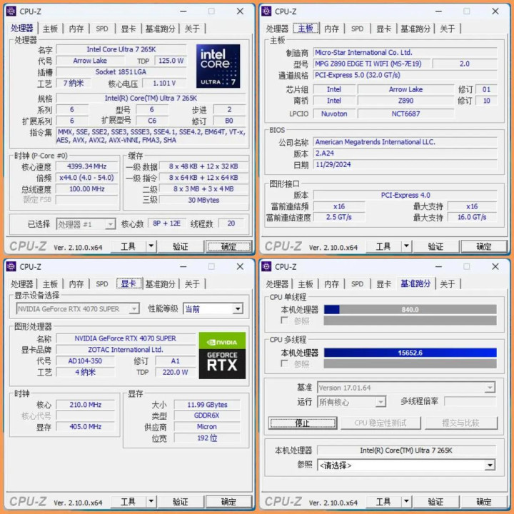 初始默认设置(PL2 250W,XMP开启)下,英特尔酷睿265K在CPU-Z测试中,单核得分840,全核得分15652.6。