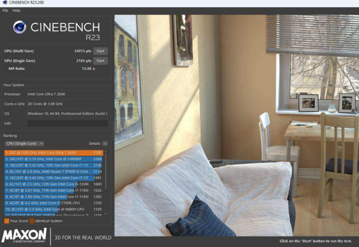 CINEBENCH R23测试结果:单核至2185,全核34915分。