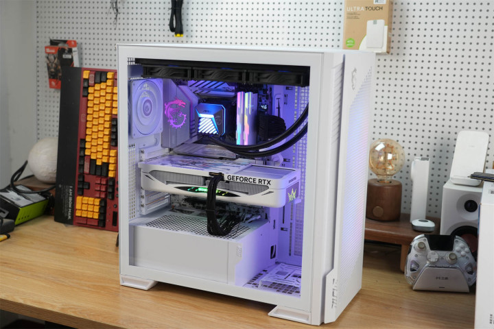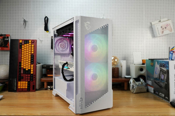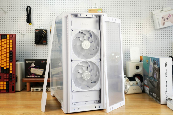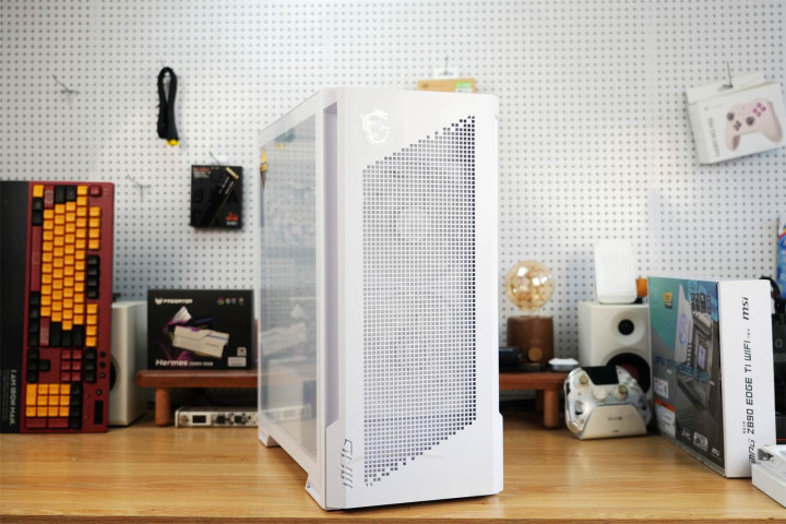 机箱前脸运用金属冲孔网打造,配以微星标志性龙盾LOGO及MPG系列标识,于简约格调间尽显科技风范。侧透玻璃选用白透材质,通透度高,能清晰呈现内部硬件与ARGB灯光。机箱右侧为整块钢板,且两侧均设通风mesh网孔。