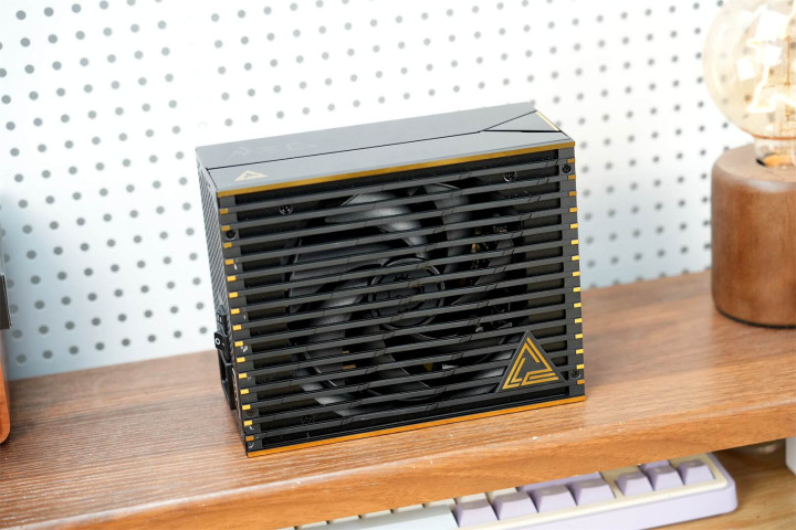 微星MEG Ai1600T PCIE5超神电源通过了PPLP、80 PLUS和CYBENETICS等多家权威机构的钛金评定,该电源手感较沉,但长度在同功率产品中偏短,尺寸为190×150×86mm,重约2525g。其风扇格栅设计独特,金色线条为亮面金属材质,光线照射下金属光泽耀眼,提升了产品高级感;右下角还有金属超神系列LOGO,辨识度更高。同时,格栅采用简约平行线条设计,经阶梯式下沉雕刻处理,侧面看如刻有龙爪,力量感与立体感十足。