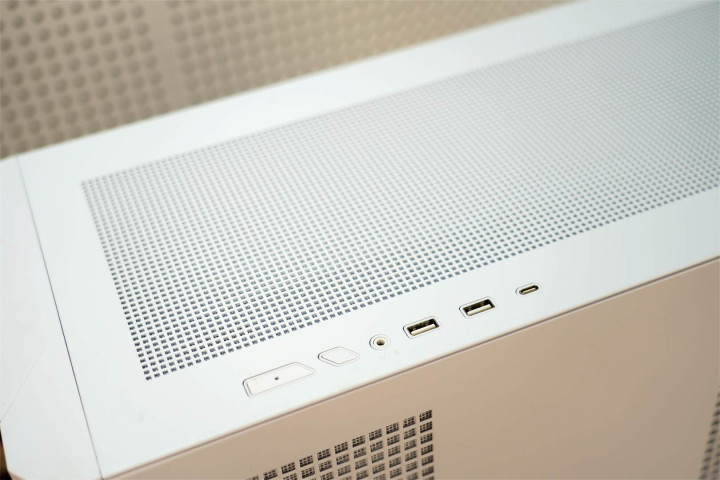 顶部也运用了mesh设计,右前方的I/O区域整合了1个速率达20Gbps的USB 3.2 Gen2x2 Type-C接口、2个USB-A接口以及音频插孔,兼顾高速数据传输与桌面插拔便利性。