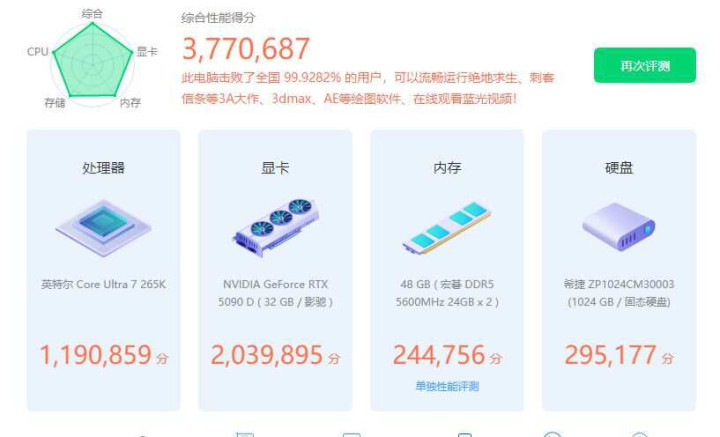 鲁大师跑分约为377067分,其中119W分,内存24W分,显卡203W分,硬盘得分30W。