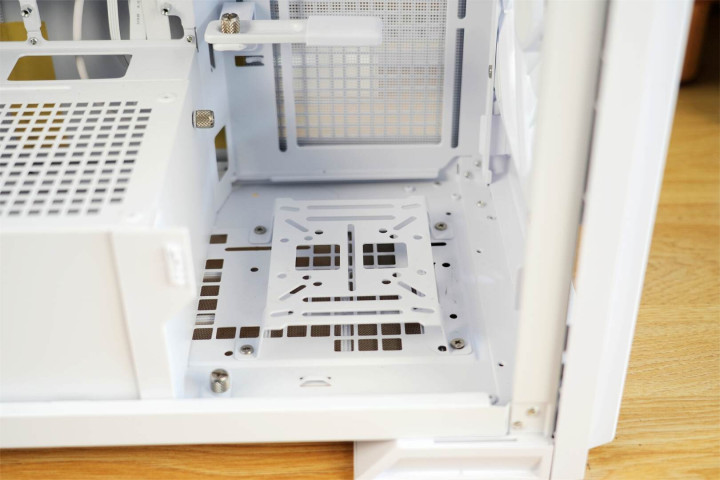 机箱在存储扩展设计上配备有1个设置在电源仓前部的Combo硬盘架,同时于机箱背面规划出4个2.5英寸SSD专用安装位以及1个3.5英寸HDD安装位。